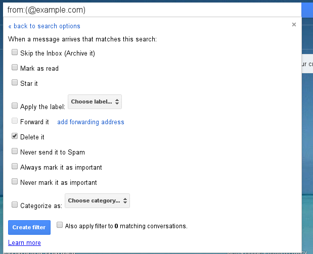 3-و در آخر باکس کنار Delete it  رو علامت دار کنید و دکمه Create Filter رو فشار بدید.